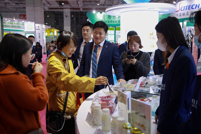 展會(huì)期間,明月海藻集團(tuán)展區(qū)吸引了眾多觀眾的目光。現(xiàn)場(chǎng),燕麥爆珠、紫米爆珠等產(chǎn)品熠熠生輝,晶球、魚(yú)子等產(chǎn)品更是交相輝映,香腸、丸子的香氣四溢,引得觀眾們紛紛駐足品嘗。專(zhuān)業(yè)觀眾及嘉賓們?cè)谠嚦悦髟潞T宓慕】凳称泛螅瑢?duì)其口感和品質(zhì)贊不絕口,并就海藻健康解決方案展開(kāi)了深入的交流與探討。