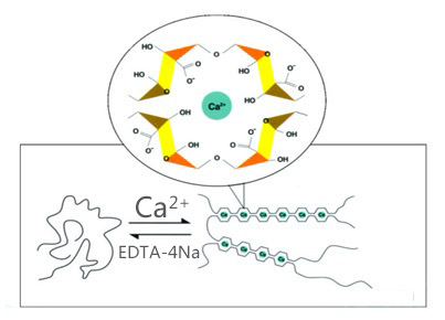 海藻酸銨遇到鈣離子可迅速發生離子交換,生成凝膠,其凝膠具有熱不可逆性。高G型海藻酸鹽生成的凝膠硬度大但易碎;高M型海藻酸鹽生成的凝膠則相反,柔韌性好但硬度小。調整兩種比例可生產不同強度的凝膠。